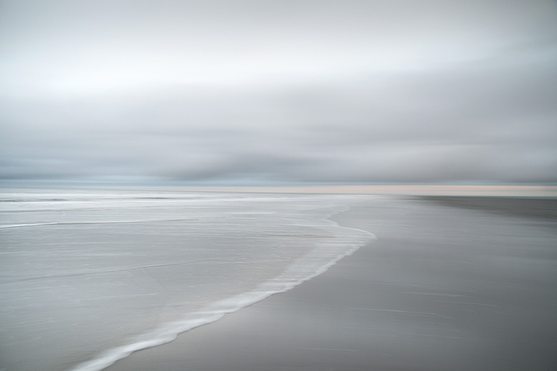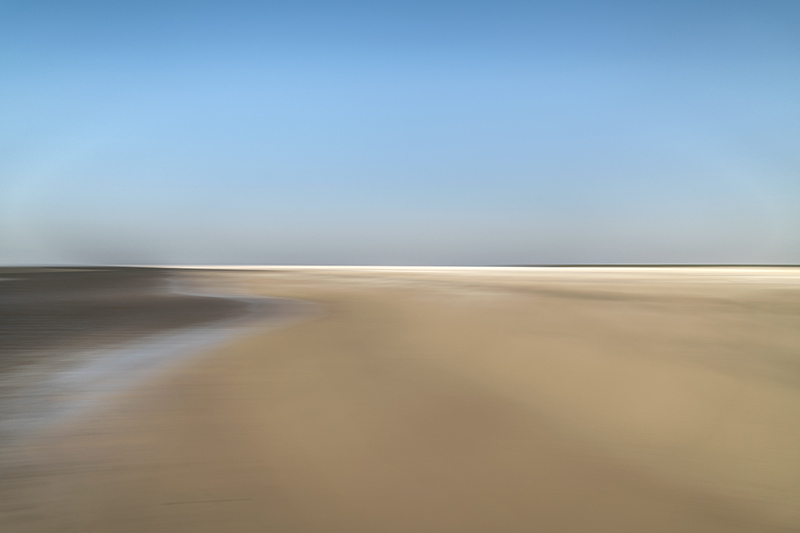 Horizontale Bewegungen der Kamera während längerer Belichtungszeiten schaffen filmische Landschaften. In der Spannung von Dynamik und Ruhe konvergieren Meer und Himmel an der Horizontlinie, wo sich Weite und Tiefe dem Greifbaren entziehen.